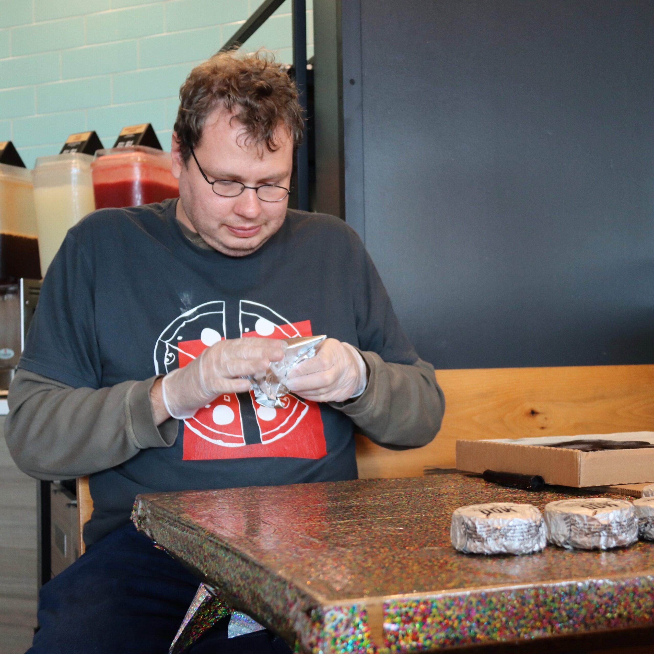 On any given day, you’ll find him preparing pizza boxes, wrapping and packaging cakes, and helping to set up the restaurant for success, all while sharing laughs and conversation with teammates and customers alike.